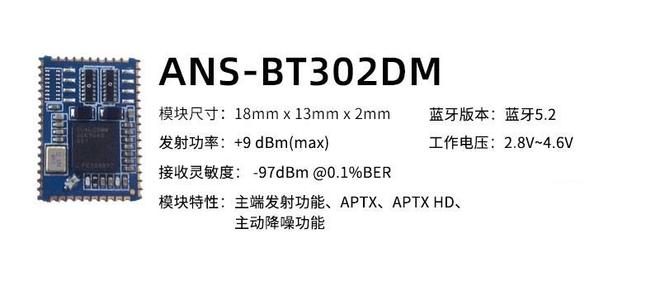 主端音频蓝牙模组ANS-BT302DM使用QCC3040方案,可以用于无线音频传输,允许用户在跑步机或健身车上享受音乐、视频音频、语音指引等内容。这种方案的主要组成部分包括: